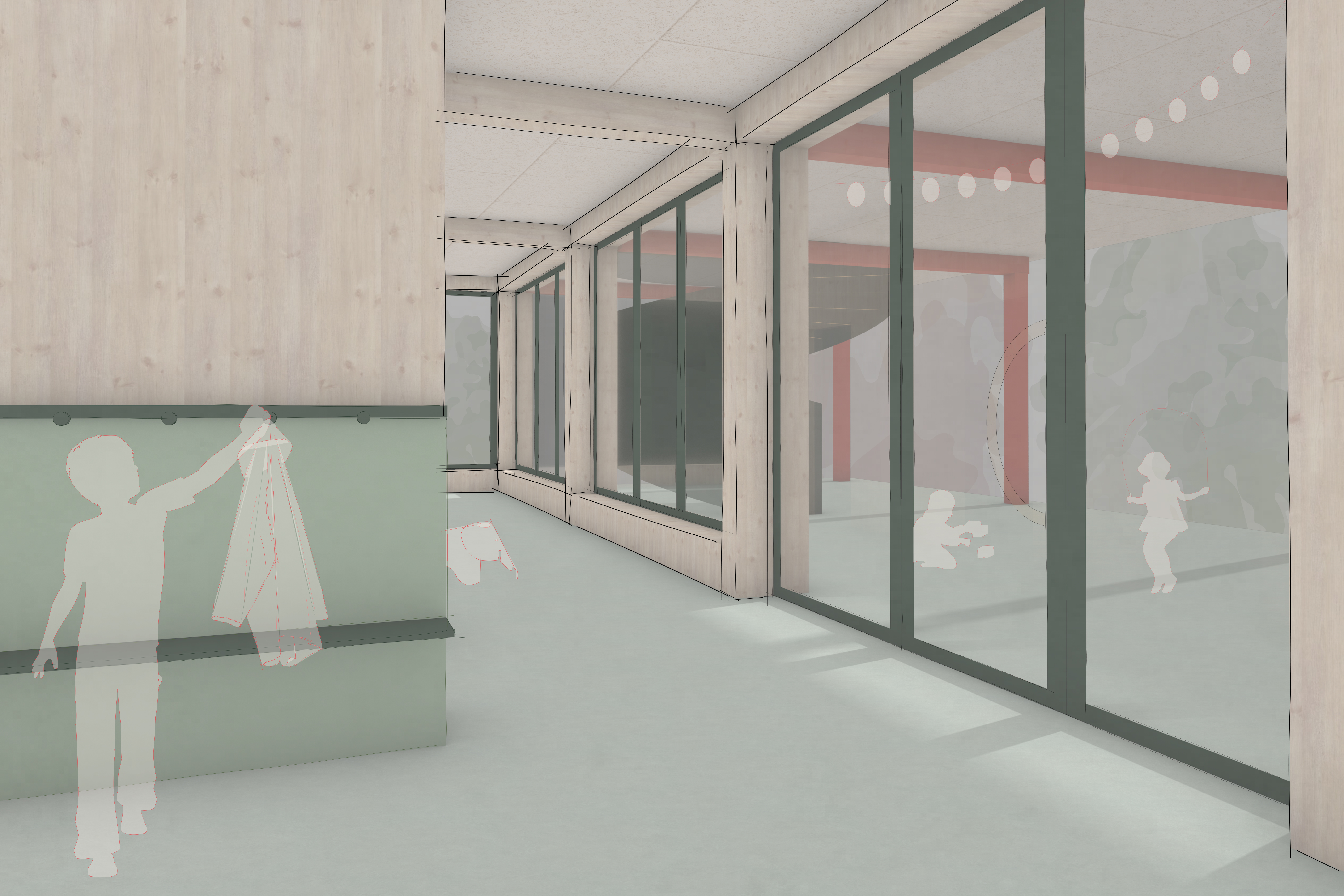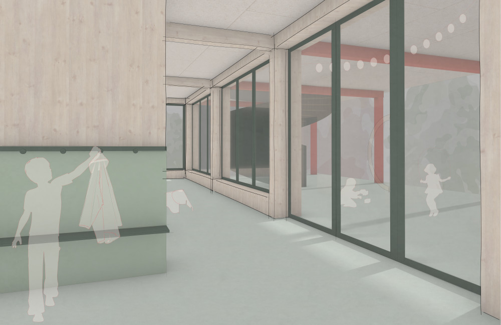 Das Freiraumkonzept setzt auf ökologische Nachhaltigkeit mit artenreichen Grünflächen, einheimischen Bäumen und einem durchdachten Wassermanagement im Sinne der Schwammstadt. Vielfältige Aufenthalts- und Spielbereiche fördern Erholung und Begegnung. Architektonisch wird die Anlage durch Neubauten ergänzt, die funktional und gestalterisch aufeinander abgestimmt sind. Die Primarschule überzeugt durch flexible Lerncluster und offene Raumstrukturen, während nachhaltige Materialien und ein naturnahes Farbkonzept die Verbindung zur Umgebung stärken. Insgesamt entsteht ein moderner, lebendiger Bildungsort im Einklang mit Natur und Architektur.