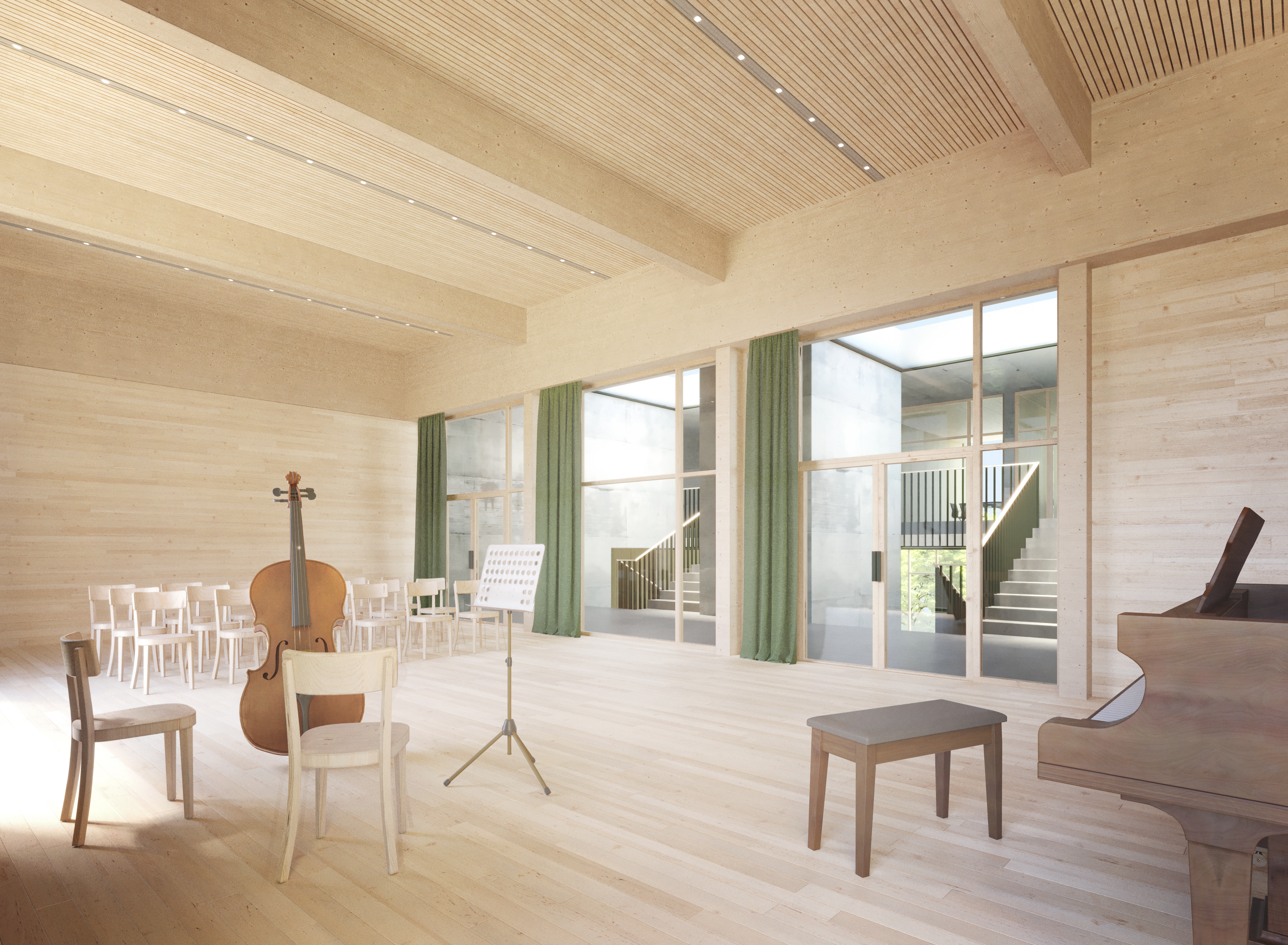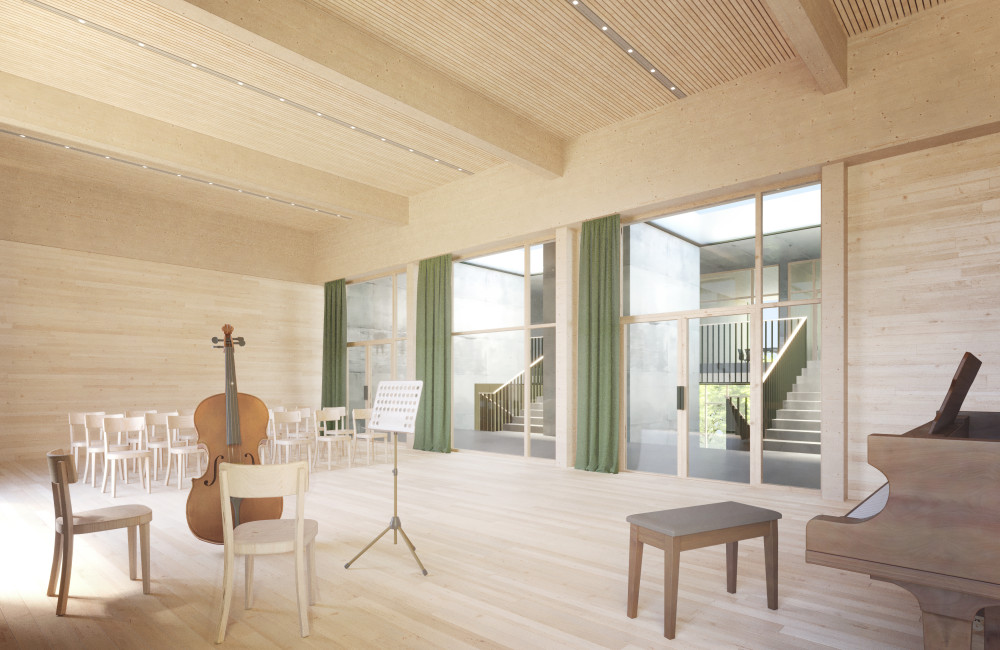 Innenräume zeichnen sich durch Holz, Beton und viel Tageslicht aus und folgen einer klaren Raumlogik: Klassenräume flankieren das zentrale Treppenhaus mit Bibliothek und Mehrzweckraum. HLKS, Brandschutz und Haustechnik sind energieeffizient, flexibel und zukunftstauglich geplant.